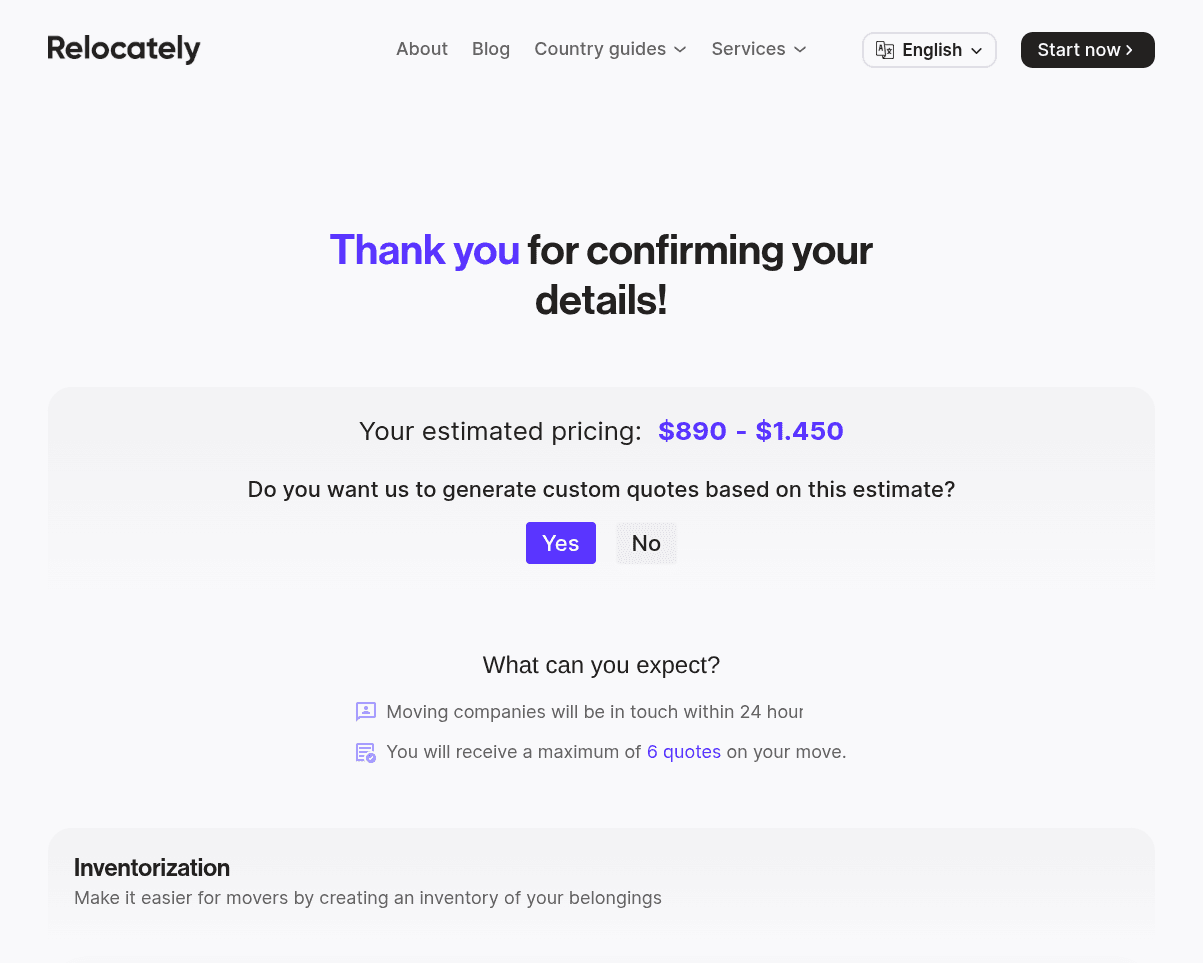 Providing customers with a clear estimated price range empowers them are of the potential costs and budget. When potential movers understand the expected cost of their relocation, they can assess feasibility, align expectations, and plan their budget with confidence. This transparency reduces uncertainty, filters out unrealistic inquiries, and attracts more serious, financially prepared customers. As a result, moving companies receive better-qualified leads with stronger intent, increasing efficiency, improving conversion rates, and reducing time spent on non-viable requests.