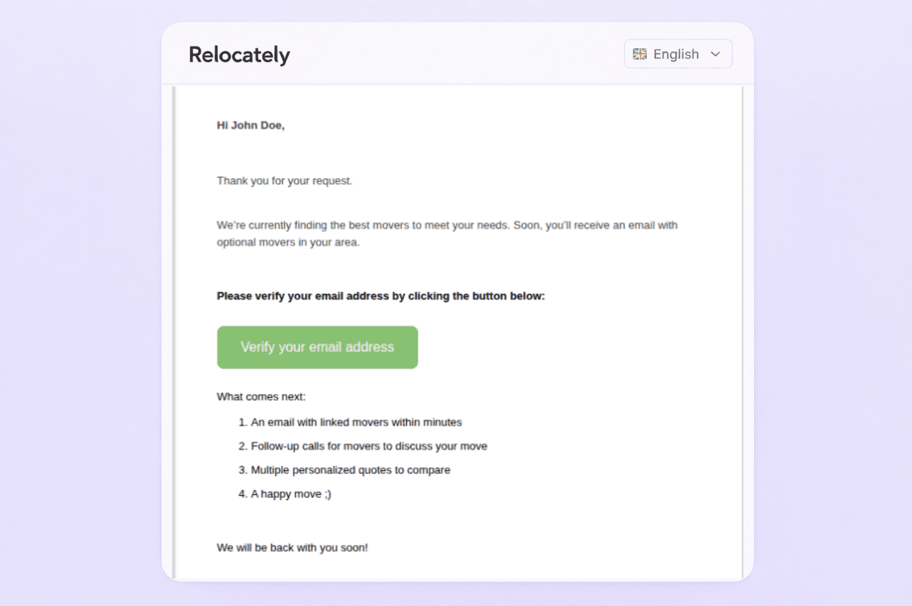 To further strengthen lead reliability, Relocately has implemented mandatory email verification at the submission stage. Before a request enters the distribution process, customers are required to confirm their email address through a verification step.